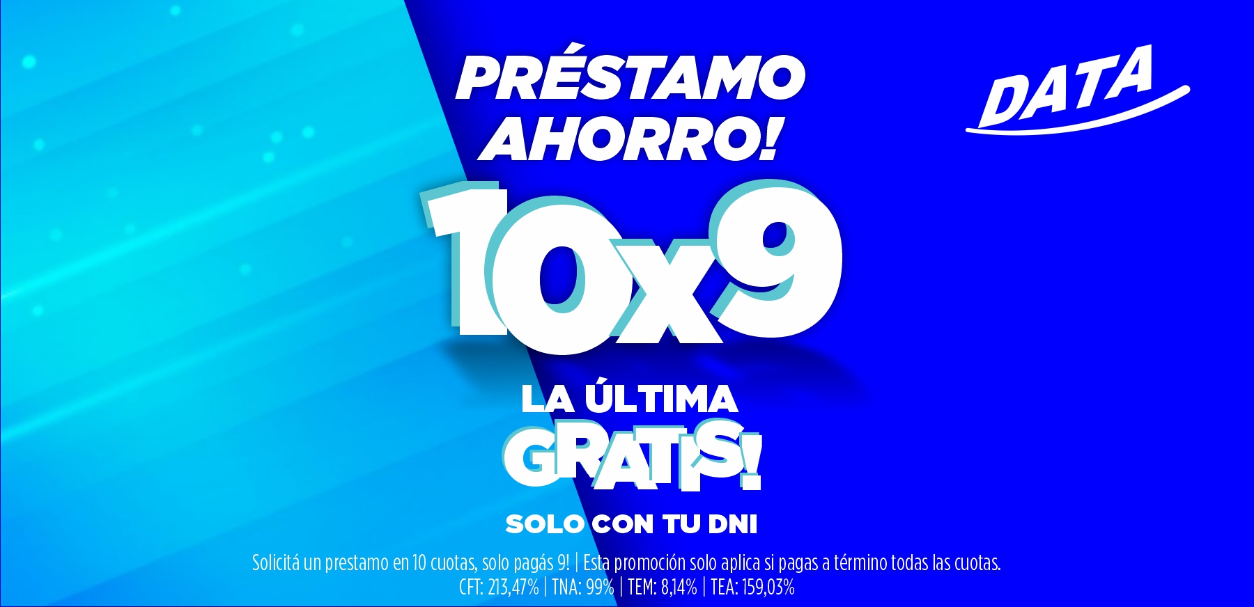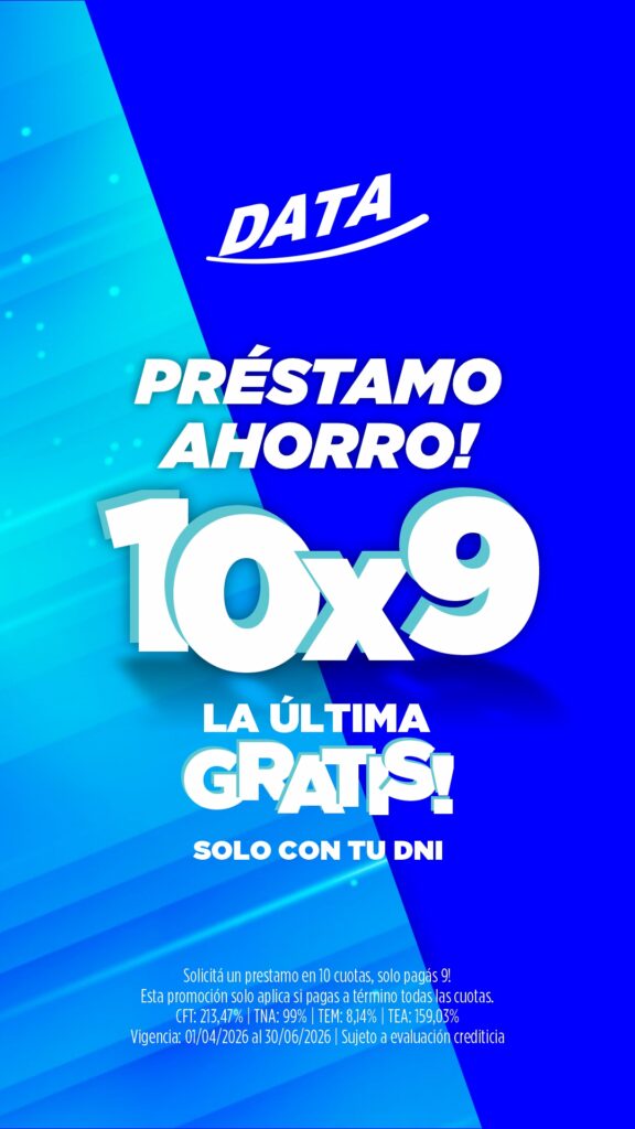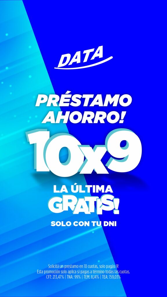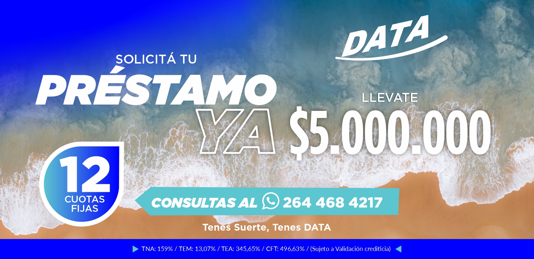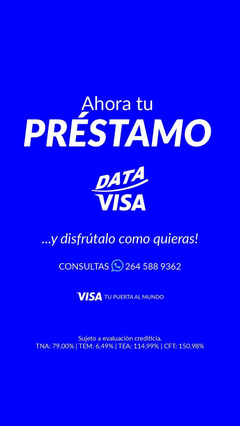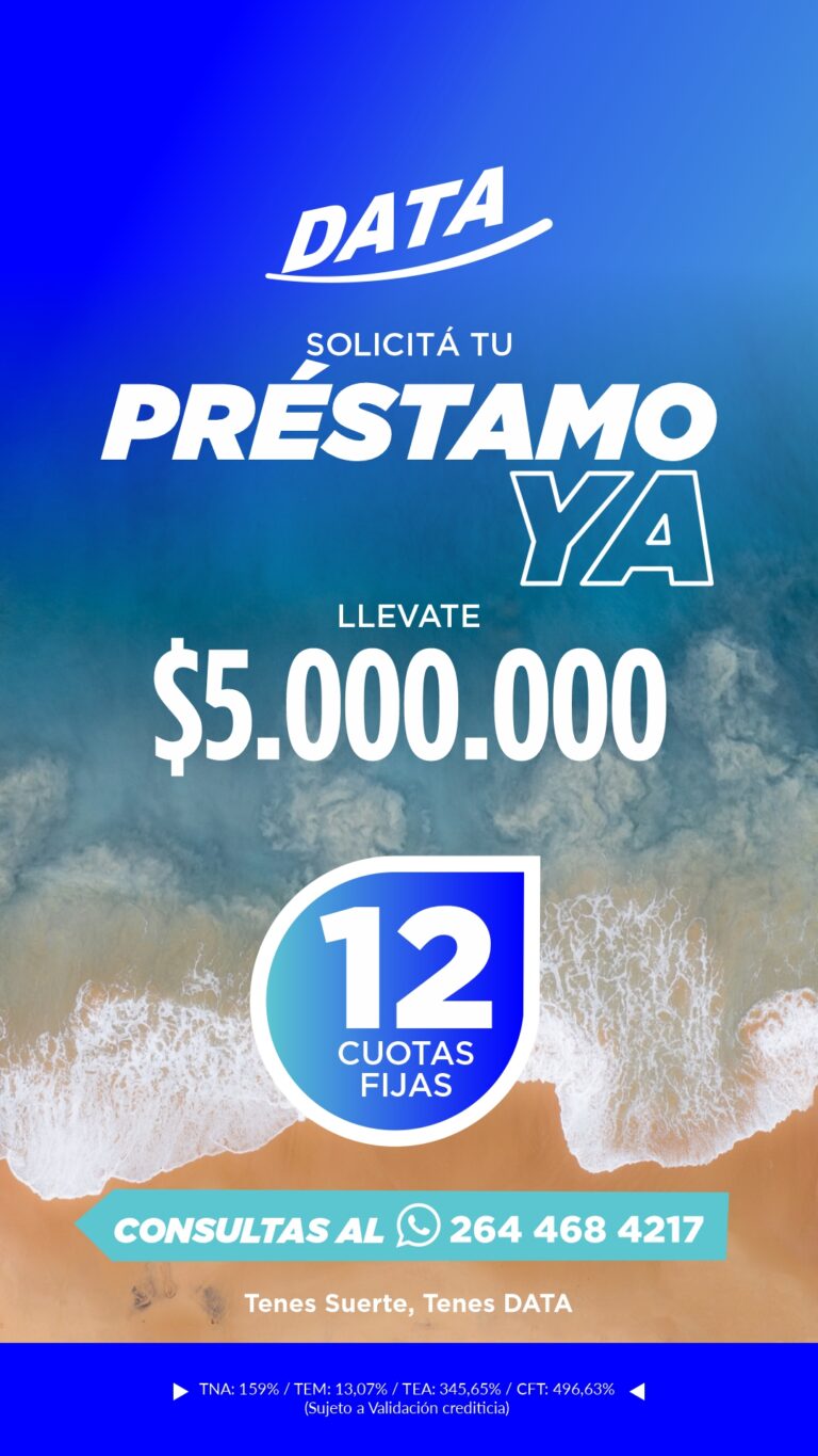 Empresa Data 2000 S.A., te otorga un préstamo con cuotas fijas y en pesos, que será debitado de tu tarjeta de crédito. Por asesoramiento, dirigirte a nuestras sucursales, con tu DNI. o Comunicate al 2644684217.